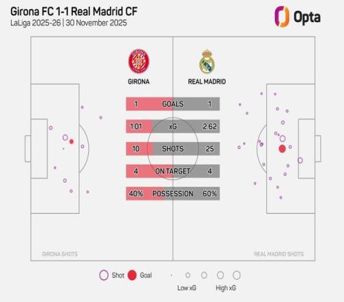 此役客场对阵赫罗纳,皇家马德里尝试了25次射门,其中4次射正,最终仅打入一粒点球,1-1战平对手。