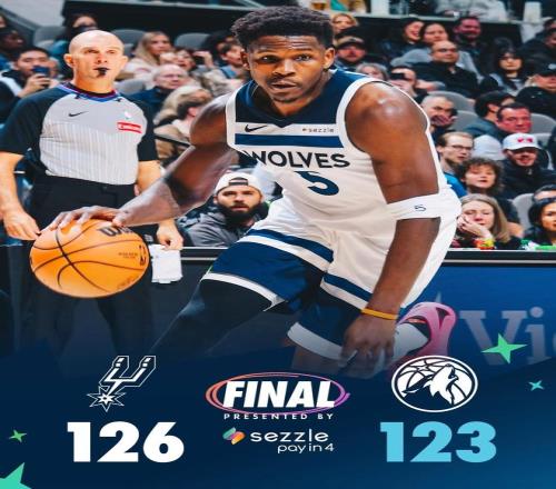 芬奇请求暂停,随后抱怨判罚吃到技术犯规,文班亚马罚球不中,爱德华兹轰进续命远投。米奇约翰逊请求暂停,福克斯2罚全中,爱德华兹2罚1中,尚帕尼2罚不中。文班亚马抢下前场篮板被爱德华兹犯规,文班亚马2罚1中。距离终场仅剩1.3秒,爱德华兹超远绝平3分球不中,比赛时间走完。最终,马刺以126比123险胜森林狼,拒绝了25分逆转。