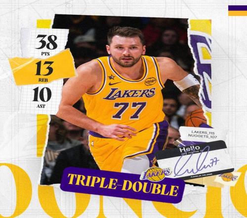 NBA常规赛继续进行,洛杉矶湖人队(26胜16负)拿到连胜。东契奇得到38分、13个篮板和10次助攻,勒布朗得到19分、9个篮板和8次助攻,他们率队下半场掀起反扑,湖人队逆转最多16分落后,他们在客场以115-107险胜丹佛掘金队(29胜15负)。湖人队拿到2连胜,掘金队遭遇2连败。
